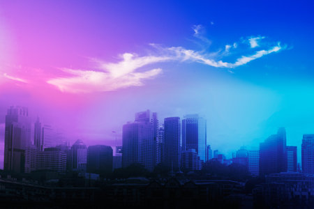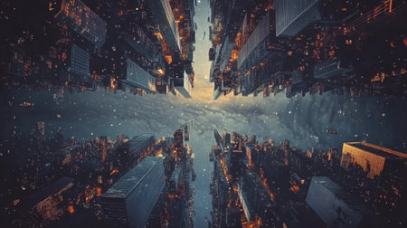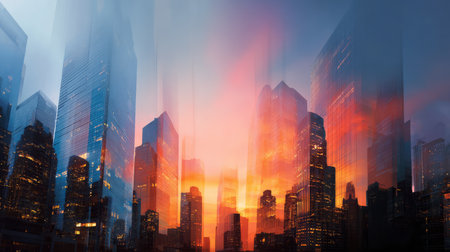 Captivating abstract aerial view of a city skyline at dusk, showcasing stunning architecture illuminated by lights against artistic clouds.