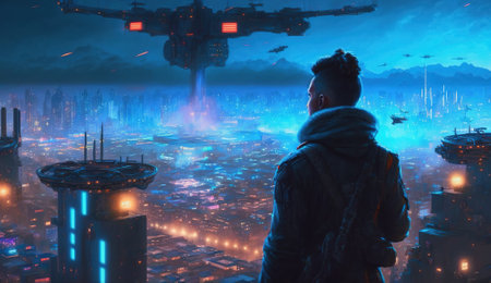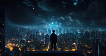 Cyber city at night, man looks at futuristic buildings from skyscraper roof, generative AI. Urban scene with cyberpunk cityscape. Concept of the future, metaverse, technology, game.