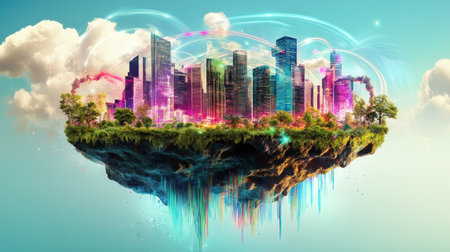 A stunning city skyline emerges from thick clouds under a vibrant sunset, enhanced by digital data visualizations, symbolizing growth and innovation.