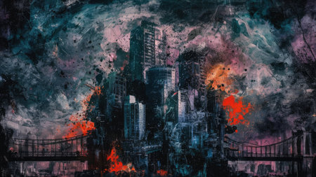 abstract fire in the city, color painting on canvas, art illustration
