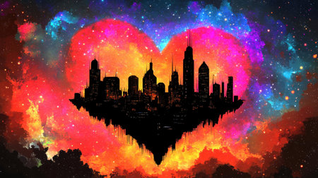 A city skyline silhouette is nestled within a heart shape formed by a colorful cosmic nebula.