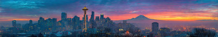 A stunning panoramic view of a modern city skyline at twilight, showcasing tall buildings and vibrant colors against the sky.