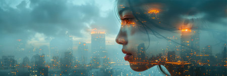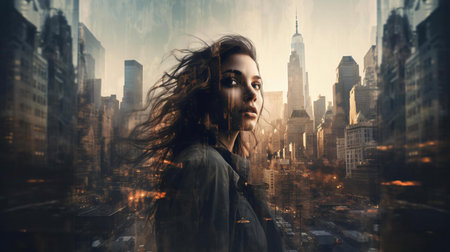 Double exposure of woman face and city background.