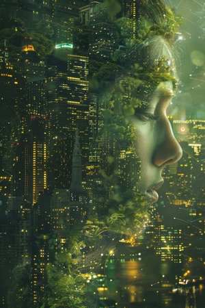 A man's face emerges dramatically in the midst of a bustling cityscape. The fusion of the urban environment with the human element creates a striking and thought-provoking image.