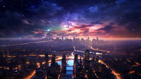 A nighttime cityscape is illuminated by lights from buildings and cars. The composition features long exposure light trails along a highway. Above the urban environment is a mesmerizing starry sky. The scene is presented with a dramatic perspective and contrasting colors.