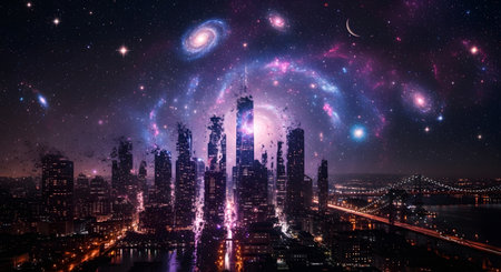A sprawling futuristic city with towering skyscrapers is illuminated by the ethereal glow of a colorful nebula and distant galaxies.