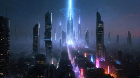 Futuristic city skyline at night with towering skyscrapers neon lights and a glowing luminescent urban landscape Dramatic abstract and technologically advanced cityscape