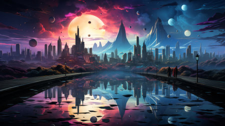 A stunning urban landscape featuring a vibrant skyline reflected in calm waters during sunset, showcasing colorful clouds and lights.