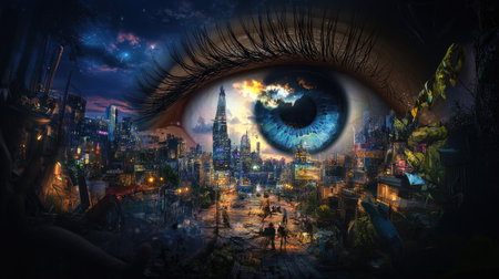 A captivating surreal image featuring a large, vivid eye watching over a dynamic futuristic cityscape at twilight, merging nature and architecture seamlessly.