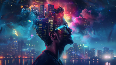 Man gazing at a glowing urban skyline reflected on his facial silhouette, contemplating the dynamic nature of city life.