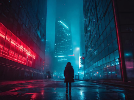 A man's silhouette stands against a colorful city skyline illuminated by lights at twilight. The vibrant red and blue hues create an energetic atmosphere, showcasing urban life.