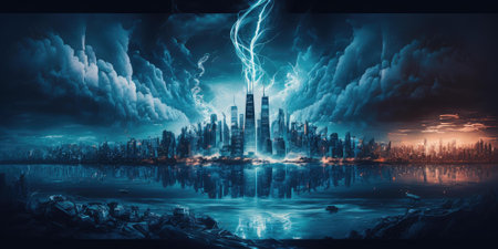 Destructive and powerful thunder storm strike metropolis city with thunderbolt. superlative generative AI image.