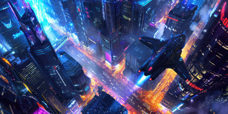 Neon-lit futuristic city filled with flying cars and towering skyscrapers