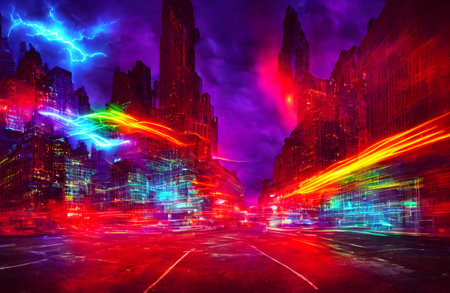 Artistic depiction of a bustling city street, enhanced with intense neon and cyberpunk aesthetics