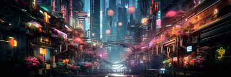 This digital painting depicts a city street bustling with activity under a starry night sky, Abstract of a bustling market in a futuristic city, AI Generated
