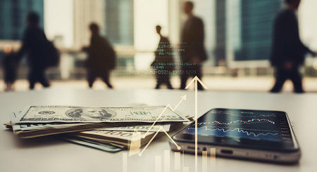 Stack of US dollar bills, pens, and a smartphone displaying financial graphs on a table in a modern office setting.