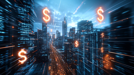 This visually engaging abstract business background highlights sleek modern buildings, coins, and financial icons, representing innovation, investment, and the vibrant synergy of urban growth