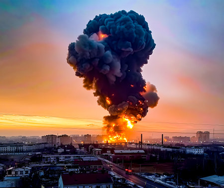 An industrial complex erupts in flames, lighting up the night with fiery orange hues. Thick smoke ascends, casting a dramatic silhouette against the skyline, marking a chaotic evening.