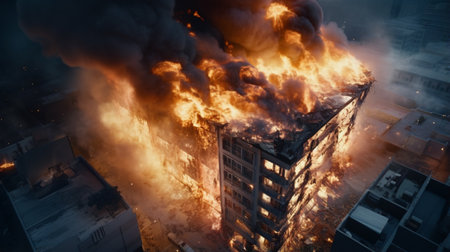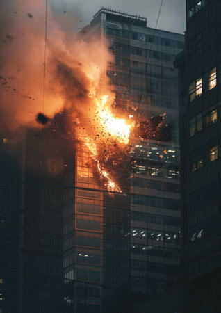 Dramatic Blaze in High Building: Striking image of a dramatic blaze raging on a floor inside a tall building, conveying the severity of the situation