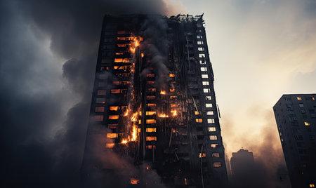 Apartment building fire in the city, skyscraper burning, the problem of extinguishing high-rise houses