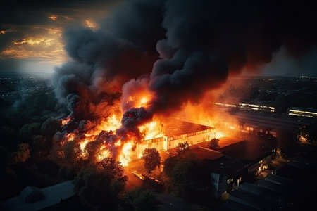 Large flames and thick smoke billowing from a burning industrial complex at night, creating a dramatic and devastating atmosphere filled with danger and destruction
