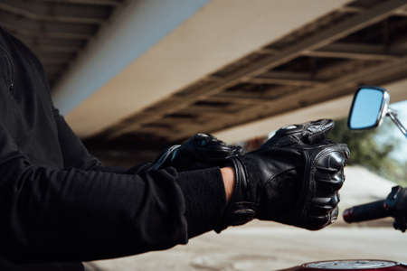 Motorcyclist puts on black leather gloves on hands.Man putting on protective gloves before riding a motorcycle