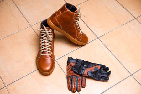 Motorcycling Relative Topics. Closeup of Protective Motorcyclist Leather Tan Sneakers Placed Indoors Along With Leather Gloves On Pale Tiles Floor. Horizontal Shot