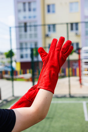 Hand in a red work glove on a blue background. Hand of a man in a protective glove demonstrates an open palm. Male European race. Work safety, workwear.