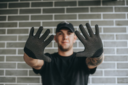 A man shows his hands in protective gloves, preparing for manual labor or mechanical work.