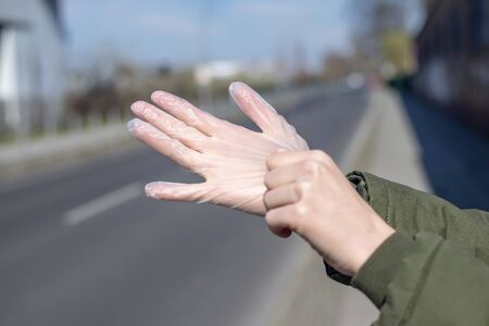 Crop close up of woman put medical rubber gloves against contagious Chinese corona virus pandemics, female wear protective hands gear from covid-19 epidemics, coronavirus, healthcare concept