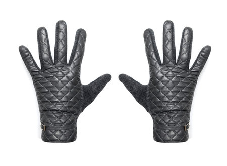 Female hands in black gloves show gestures, signs and symbols isolated on white background. Two hands are crossed together in fingers the form of a chain.