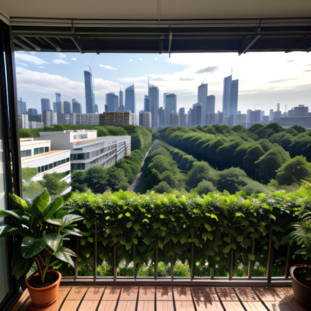 A stunning urban scene showcasing lush green vegetation seamlessly integrated with modern architecture, creating a peaceful atmosphere in a bustling city.
