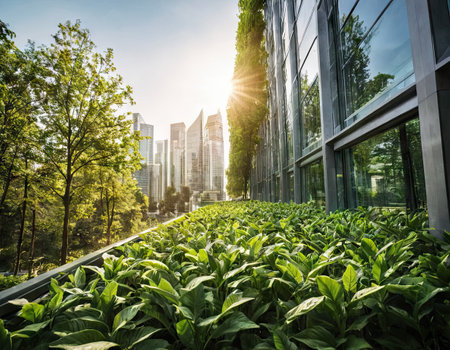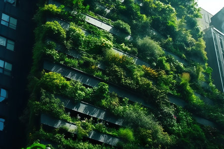 Experience the harmonious blend of nature and architecture in this captivating image of green architecture. Witness a skyscraper building adorned with plants growing on its facade, creating a vertical green oasis that breathes life and beauty into the urban environment.