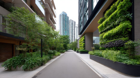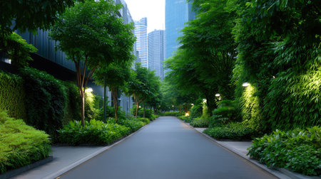 A tranquil urban walkway adorned with vibrant greenery and modern architecture. This serene path invites exploration and highlights the beauty of nature within the city.