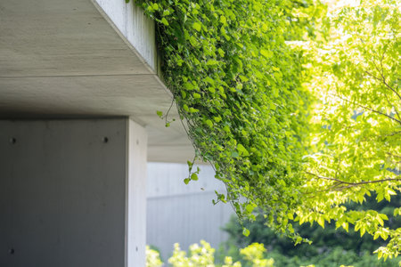 Vibrant green vines gracefully cascade down from a concrete overhang blending nature and architecture on a sunny day.