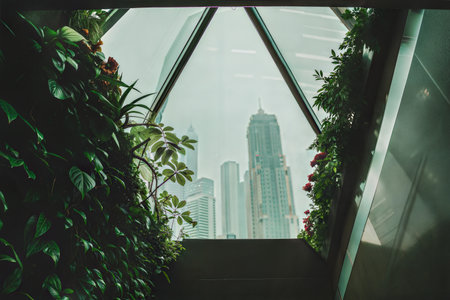 Lush greenery contrasts with a modern cityscape viewed through a triangular window.
