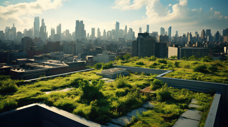 A lush green patch thrives atop a building, highlighting the integration of nature within a bustling urban landscape.