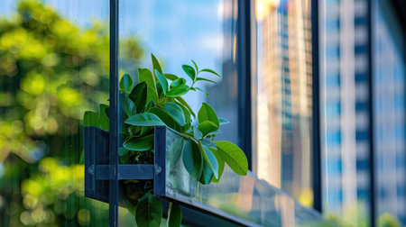 A striking image of a lush green plant thriving on a sleek glass window, framed by a bustling urban backdrop. Natural light enhances the fresh atmosphere.