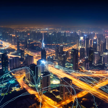 Captivating aerial view of a vibrant city at night, showcasing illuminated traffic patterns weaving through urban streets, highlighting modern infrastructure and dynamic movement.