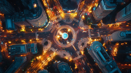 An aerial view captures the mesmerizing swirl of car lights, creating a dynamic urban vortex on the citys roads at twilight.