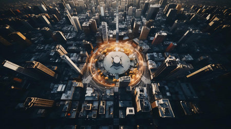 Aerial view of a bustling city intersection featuring a prominent circular traffic light amidst urban architecture and vehicles,.