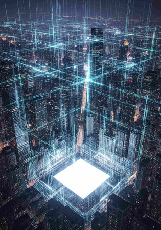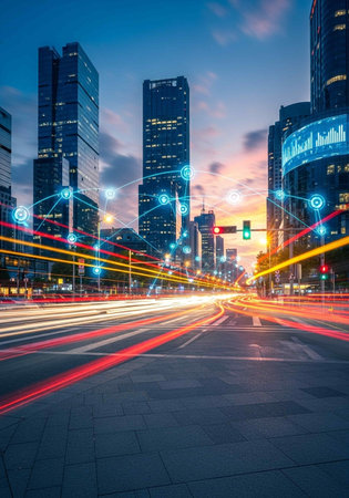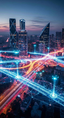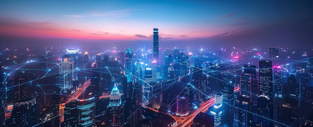 Luminous Network Dynamic Urban Landscape With Glowing Connection Points And Intense Blues