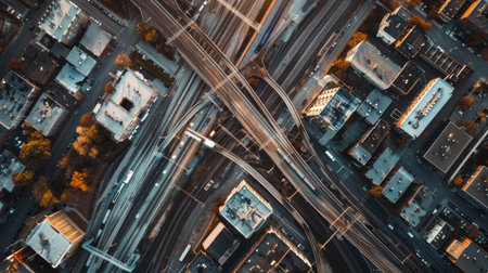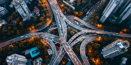 An overhead shot depicts a complex highway interchange with numerous curved roadways and overpasses. The scene showcases concrete structures, interspersed with green areas and buildings. The composition is symmetrical, featuring cars and trucks moving along the lanes, suggesting a busy urban environment. Suitable for editorial and commercial applications.