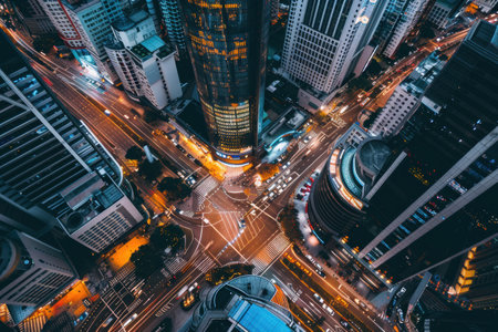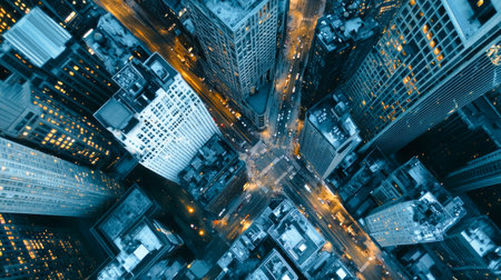 An aerial perspective captures a bustling urban intersection, bordered by towering skyscrapers and illuminated by city lights at dusk, showcasing modern city life.