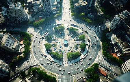 top view of a roundabout in the middle of a busy city. aerial view centered symmetrical.