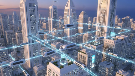 A visionary metropolis showcasing smart transportation and a vibrant interconnected network