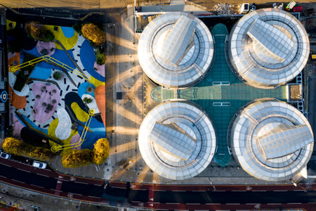 SHEFFIELD, UK - DECEMBER 16, 2021. An aerial view directly above the circular metallic buildings of Sheffield Hallam University Students' Union buildings known as The HUBS