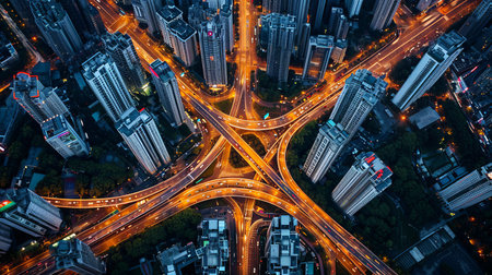 An overhead shot reveals a complex highway interchange illuminated at night. Orange and white lights trace the paths of vehicles, contrasting with the dark buildings. The image exhibits a symmetrical composition with a modern, urban aesthetic. Suitable for commercial applications such as transportation or technology themes.