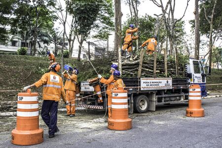 Sao Paulo, SP, Brazil, Octover 11, 2017. Municipality workers take the pruning of tree removal in Manuel Vaz de Toledo Square, in the Vila Mariana neighborhood, south of Sao Paulo