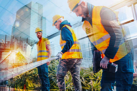 A team of male construction workers laboring on a building project at a bustling construction site.